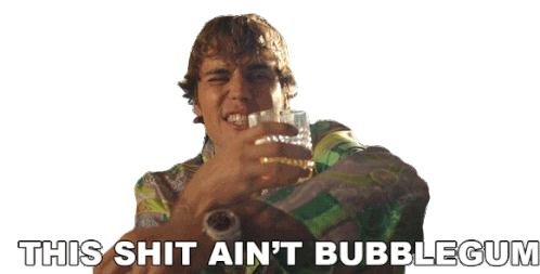 Justin Bieber holding a drink with the meme text 'This Shit Ain't Bubblegum' displayed, conveying a serious mood.