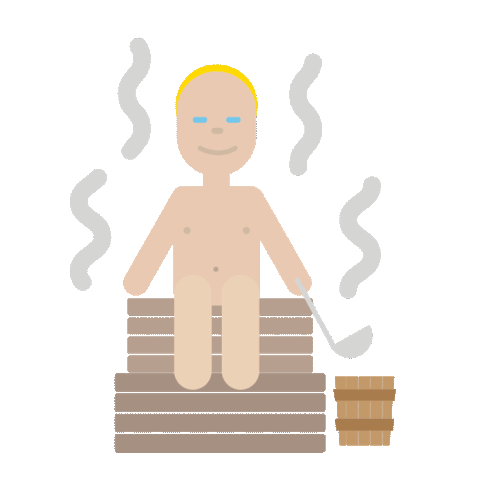 A person enjoying a traditional Finnish sauna, sitting on wooden benches with a ladle and bucket, surrounded by steam.