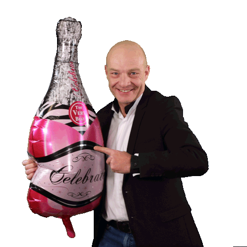 Thomashutter from Hutterconsult smiles while holding a large champagne bottle-shaped balloon that says 'Celebrate'.