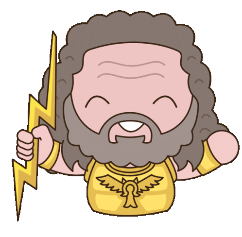 A cute, chibi-style Zeus from Marvel's Thor Love and Thunder, holding a lightning bolt with a happy expression.