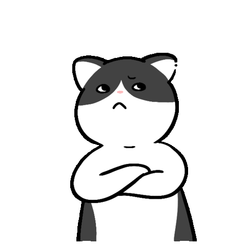 A cute cartoon cat stands with crossed arms, looking thoughtful and pondering, with a sparkle of an idea.