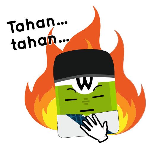 An animated sticker of a green cartoon character enduring with flames and a hand pressing its chest, with the Indonesian text 'Tahan... tahan...' (Hold... hold...), related to Thr and Eid Mubarak.