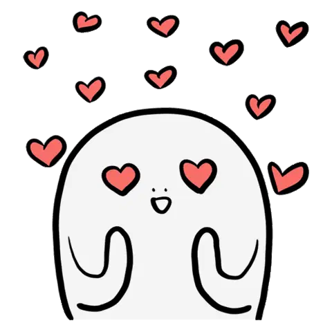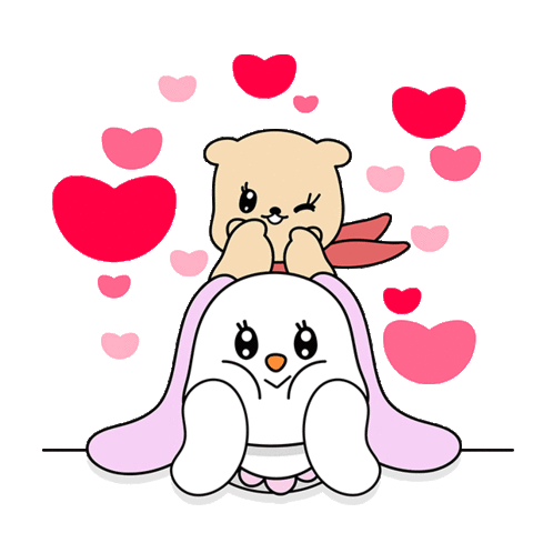 An adorable white rabbit and a small brown bear share a moment surrounded by throbbing, growing pink and red hearts, symbolizing expanding love.