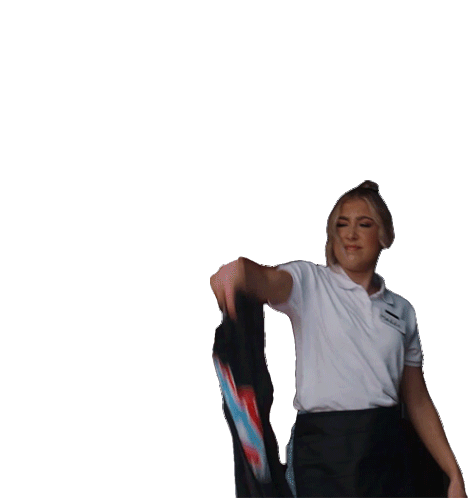 Maddie Marlow energetically throws a black shirt with a colorful design over her shoulder, expressing relief.