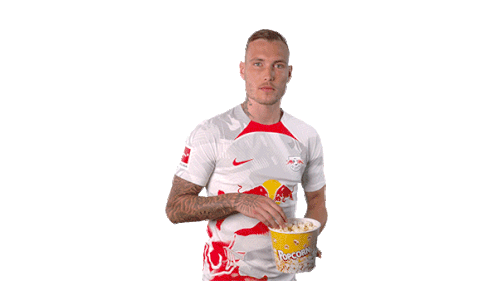 David Raum, wearing an RB Leipzig jersey, playfully throws popcorn from a bucket, expressing a "boo" or "stop it" sentiment.