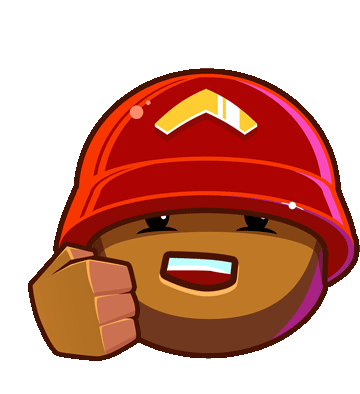 A cheerful Bloons Tower Defense (BTD) character, wearing a red helmet, gives a positive thumbs-up gesture with a wide smile.