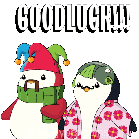 Two adorable Pudgy Penguins give a thumbs-up, wishing 'GOODLUCK!!!' in a fun, encouraging animated sticker.