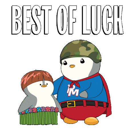 Two adorable penguins, one dressed as a superhero, wish you 'Best of Luck' with a cheerful thumbs up.