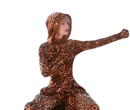 Shania Twain gives a cheerful thumbs up while wearing a distinctive cheetah print hooded jumpsuit, expressing approval or a positive sentiment.