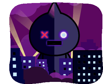 BT21 character Van as a giant, terrifying robot looms over a city under a dramatic thunder storm.
