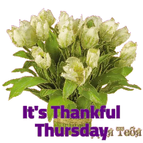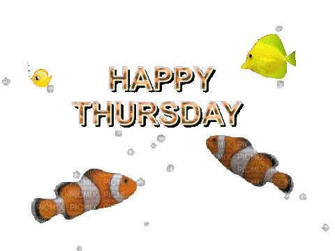Animated sticker wishing 'Happy Thursday' with colorful fish and bubbles swimming around the text.