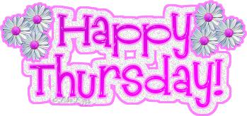 A cheerful animated sticker wishing a happy Thursday, adorned with vibrant flowers and sparkling glitter effects.