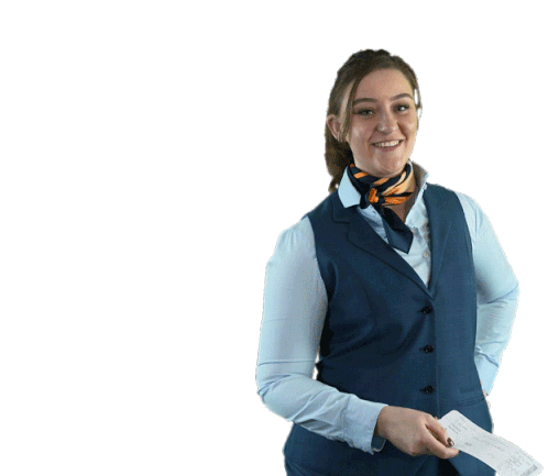A smiling airport staff member or flight attendant extends a boarding pass, ready for travel and departure.