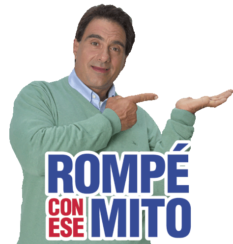 Carlos, the spokesperson for Tiendainglesa, points to the 'Rompé con ese mito' (Break that myth) campaign. Ideal for discounts and supermarket deals.