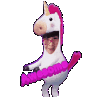 Olivia's face peeks out from a bouncy white unicorn costume, holding a pink "Awesome" sign. Fun and energetic.