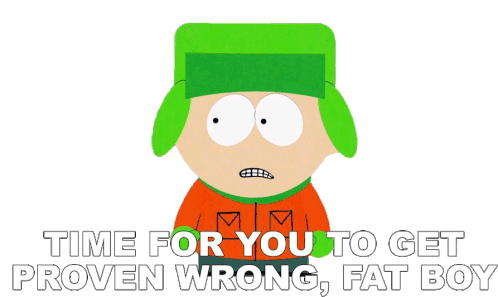 Kyle Broflovski from South Park, with a determined expression, declares 'TIME FOR YOU TO GET PROVEN WRONG, FAT BOY'.