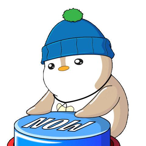 An animated Pudgy Penguin character in a red beanie, rushing forward with urgency, perfect for 'let's go' or 'hurry up' messages.