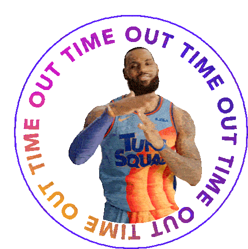 LeBron James, wearing his Tune Squad jersey, signals a time out with his hands, surrounded by the words "TIME OUT".