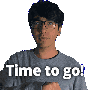 a man wearing glasses and a grey sweater says " time to go "