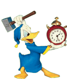Donald Duck, dressed in a nightgown, angrily raises a hammer to smash his alarm clock, expressing morning frustration.