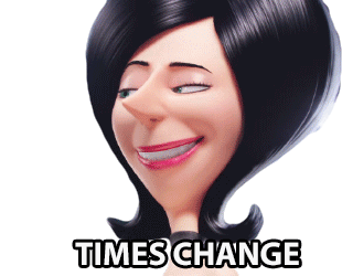 Scarlett Overkill from Minions reacts with changing expressions to the phrase 'TIMES CHANGE', reflecting adaptability.
