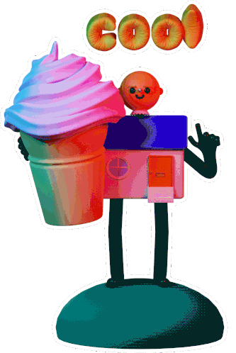 Timothy Winchester's cool ice cream character with a vibrant pink and blue swirl, making a peace sign and standing on a green hill.