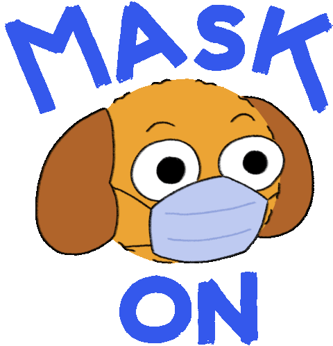 Cute Littlest Friends dog by Timothy Winchester wearing a mask with the message 'MASK ON' for public safety.