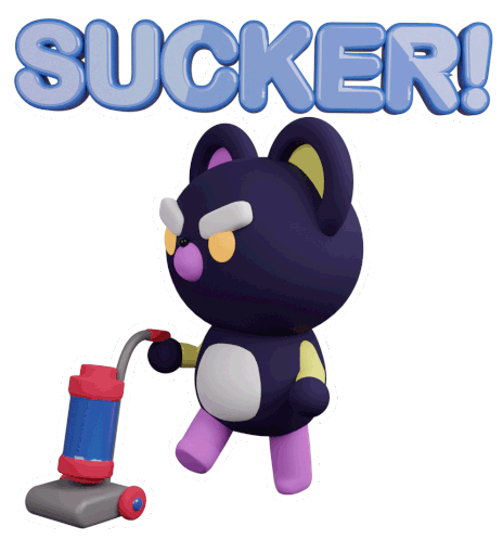A 3D animated bear character from Timothy Winchester's Peopleiknow series, holding a vacuum cleaner with the word 'SUCKER!' above its head.