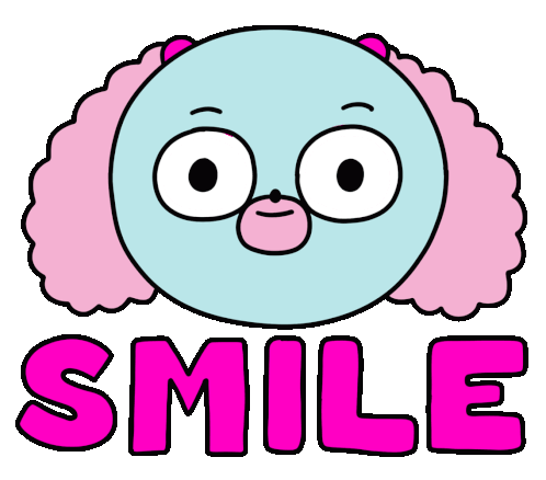 A cheerful Peopleiknow character by Timothy Winchester, with pink hair and glasses, smiles happily above the word 'SMILE'.