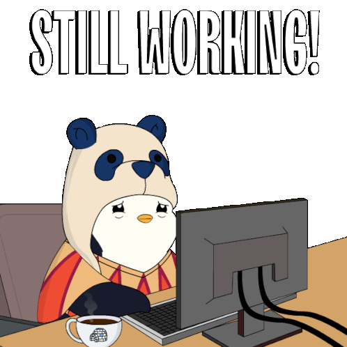A tired Pudgy Penguin wearing a panda hat works diligently at a computer, with the caption "STILL WORKING!".