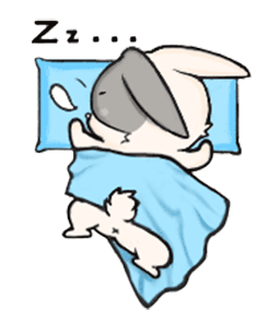 A cute cartoon bunny is sound asleep on a blue pillow under a blue blanket, with 'Z's floating above its head.