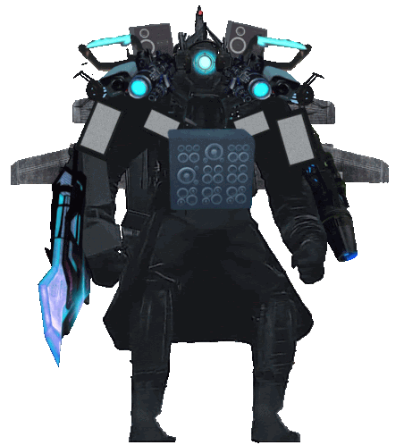 a robot with a sword and speakers on it