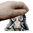 a hand is reaching out towards a gas mask .