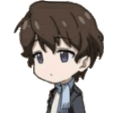 a chibi boy with brown hair and purple eyes is wearing a scarf and a jacket .