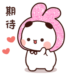Bubududu in a sparkly pink bunny hood, looking expectant with hearts floating nearby.