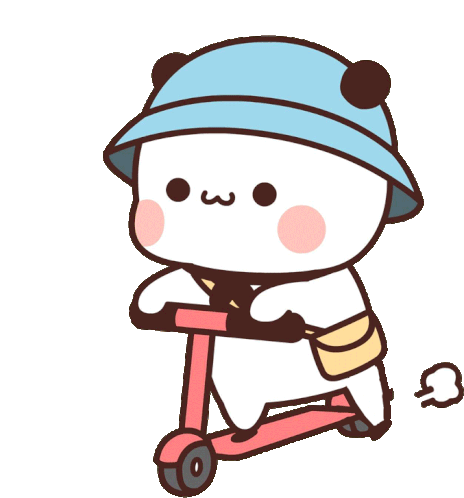 Tkthao219's Bubududu, a cute panda, happily rides a pink kick scooter while wearing a blue bucket hat and yellow bag.