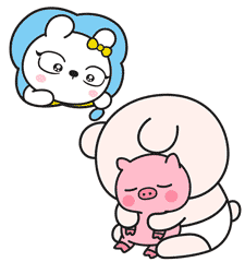 Tkthao219 Lengtoo characters: A cute bear-like figure lovingly hugs a sleeping pink pig as a rabbit-like friend watches, a heart appearing.