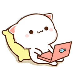 Tkthao219 Peach, the adorable cat character, sits comfortably on a yellow pillow, engrossed in her pink laptop.
