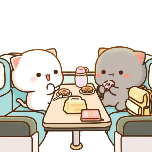 Peach and Goma, the cute cartoon cats by Tkthao219, enjoy donuts together while traveling on a train.