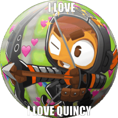 Quincy from Bloons TD 6, holding a bow and arrow, surrounded by hearts, with the text 'I LOVE QUINCY'.