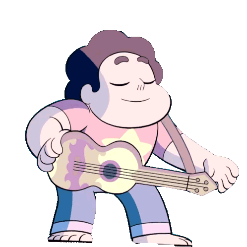 Steven Universe happily playing his ukulele, strumming with joy and enthusiasm, embodying his cheerful spirit.
