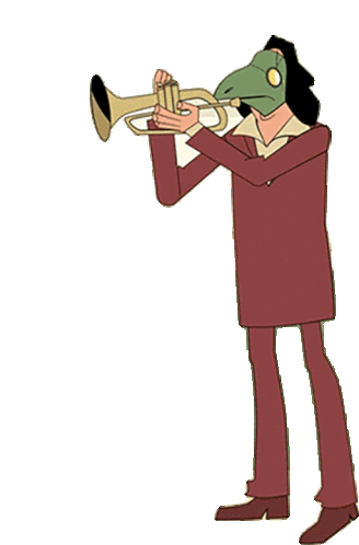 A unique character with a green mask and long hair plays a trumpet, bringing a musical vibe to any conversation.