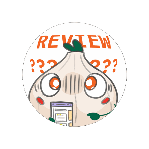 A cute cartoon garlic character looking surprised while holding a tablet, with 'REVIEW' and question marks.