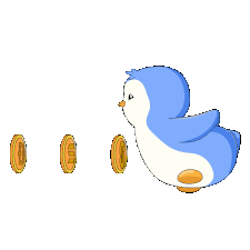 A cute blue and white cartoon penguin waddles past a row of golden cryptocurrency coins, including Vechain, Dogecoin, and Ethereum.