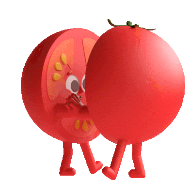 A cute, animated red tomato with legs spins around, revealing its inner seeds, symbolizing love.