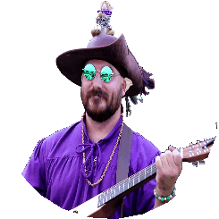 Thom Fuewellery, known as Tomfoolery, a Ren Faire bard, playing a string instrument in an animated sticker.