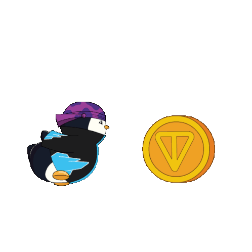 a penguin wearing a purple hat is next to a coin with the word ton written above it