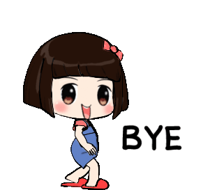 Tong Stick, a cute cartoon girl with a pink bow, waves goodbye while walking away, with the word 'BYE' displayed.