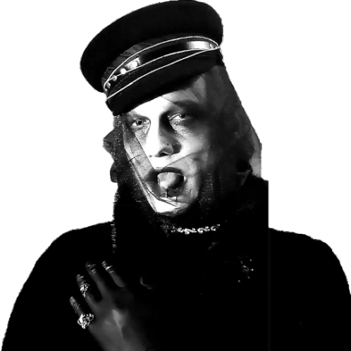 Mora Prokaza, wearing a black hat and veil, playfully sticks out their tongue in a striking black and white portrait.