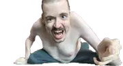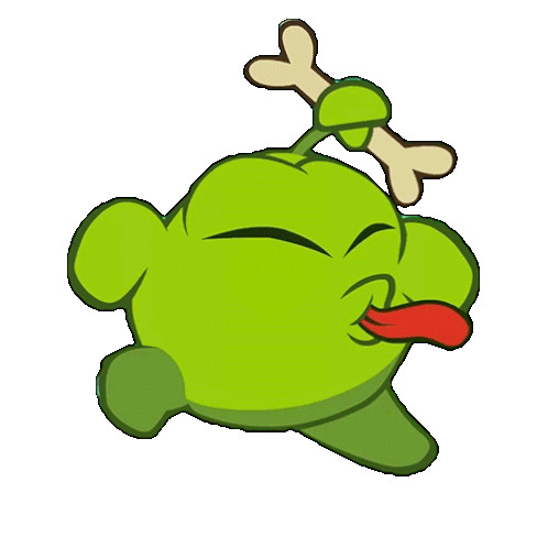 Om Nom, the adorable green character, playfully sticks out its tongue with a bone on its head.
